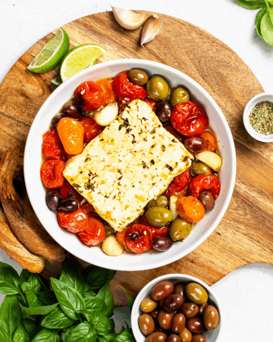 la feta, 6–8 pomodorini tagliati a metà, 6–8 olive nere Kalamata, un pizzico di origano