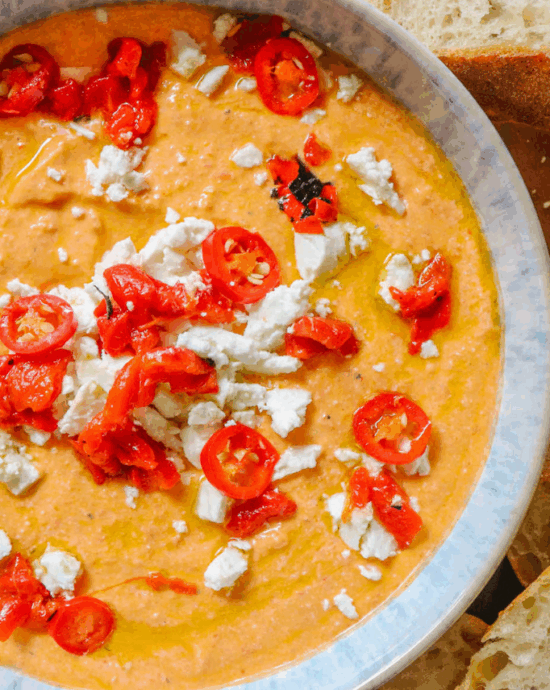 Versato in una ciotola, guarnisci con un filo d'olio, un pizzico di paprika affumicata, feta sbriciolata e se preferisci prezzemolo fresco a pioggia.